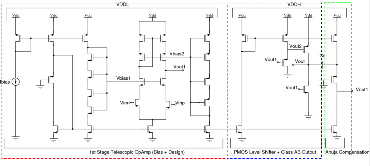 A Class-AB Output Stage is used to meet the high slew rate requirement. A PMOS source follower was used as a level shifter to increase the output of the first stage to about 1.2 V. A inverter-style Class AB output stage with its output common mode at mid-rail is designed for optimum swing. The output common mode is sensitive to the common mode of the inputs and has been set by careful tuning of parameters. The supply for this stage is chosen to be VDDH = 1.8 V to meet the output swing requirement. The sizing is done in a manner such that (i) the poles are spaced apart, to meet the target phase margin of about 76\(^\circ\) and (ii) large enough to provide the required current to meet the slew rate requirement. The sizing of the transistor and capacitor for Ahuja compensation was done carefully after the first and second stage were separately tested to meet the performance they individually needed to meet. The gm-ID script was used to optimally size the output stage transistors with a gm-ID of about 15. The following constraints were applied to the gm-ID script while deciding on the initial sizing of the second stage. All devices with total width \(\geq 5\mu m\) are implemented using multiple fingers.