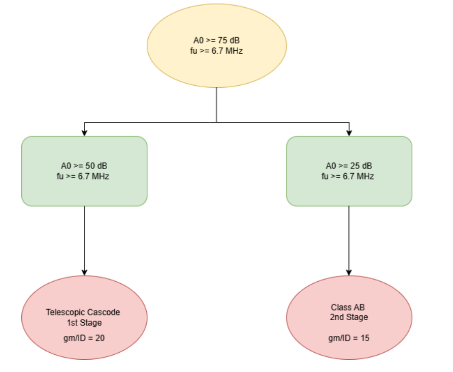 \[\frac{dV_{out}}{dt} = \frac{V_{\text{out-pp}}}{T_{\text{set}}} = \frac{1.4 V}{180 ns} \approx 7.77 \frac{\text{V}}{\mu\text{s}}\]The above high-level design specifications provide a direction and a set of constraints. These constraints would help us in determining sizes using the gm-ID methodology. However, before we use the script, we need to find out an efficient way to partition the gain requirement and bandwidth requirement across our first and second stages.