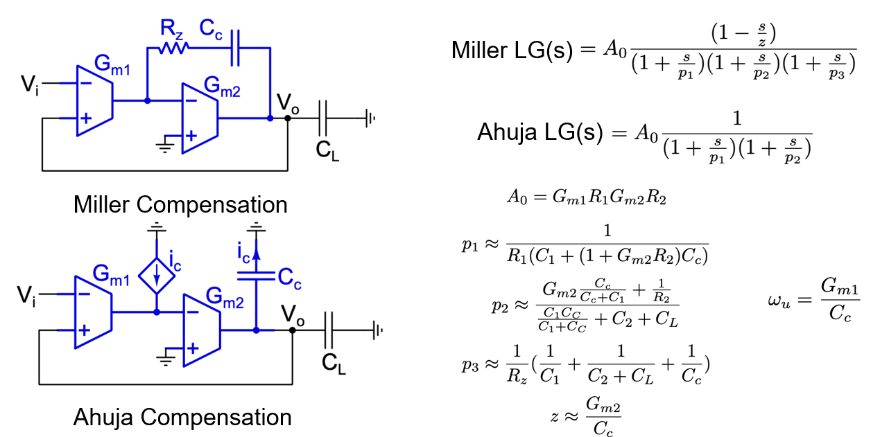 In order to achieve a high phase margin as set out earlier, it is necessary to eliminate all unnecessary sources of phase lag. The mathematical argument below justifies why Ahuja serves as a better compensation technique in this case compared to old-school Miller compensation.
