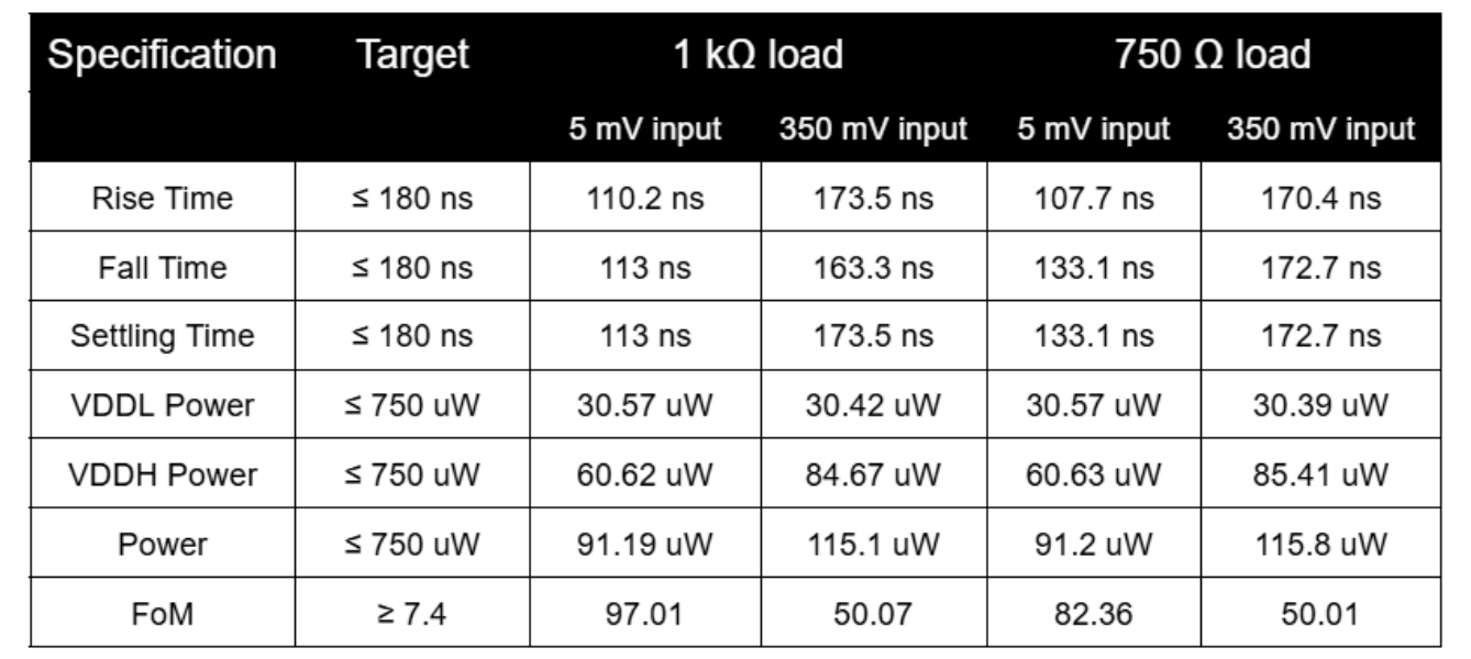 \[\text{Area of the amplifier= 251.681 } \mu m^2\] \[\text{Total Area of Amplifiers = No. of Pixels} \times 3 \times \text{Area of Amplifier} = 69. 83 \text{ mm}^2\] \[\text{Fraction of Area occupied} = \frac{\text{Area of Amplifier}}{\text{Display Area}} = 12.4 \%\]Results Summary